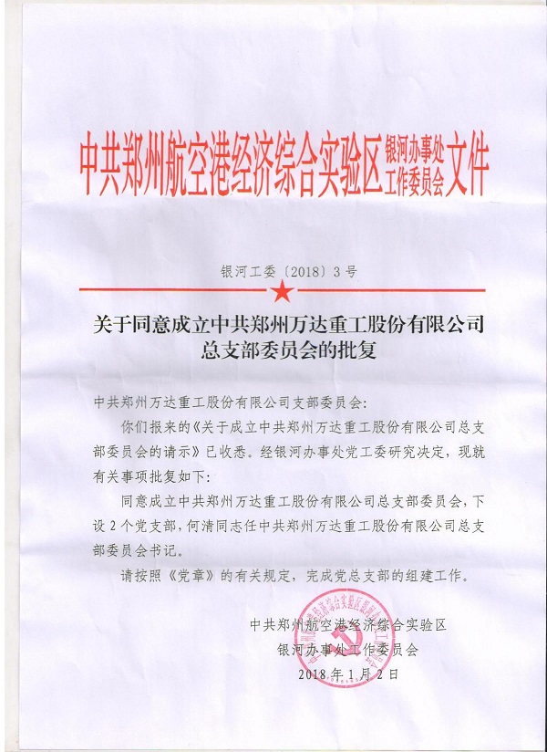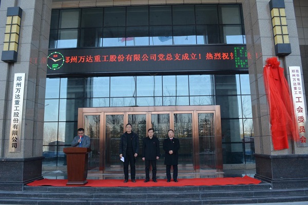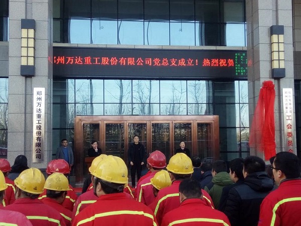 2018年1月10日上午10點整,中共鄭州萬達(dá)重工股份有限公司總支部委員會成立大會在鄭州萬達(dá)重工股份有限公司行政樓前隆重召開,鄭州航空港經(jīng)濟(jì)綜合實驗區(qū)黨工委組織部程浩部長,銀河辦事處黨工委吳順祥書記、萬達(dá)重工董事長、書記何清、公司高管、全體黨員和員工代表參加了此次揭牌成立儀式。