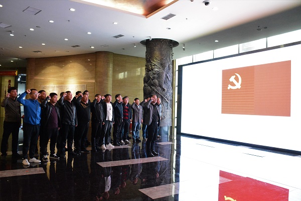 參觀結(jié)束后,在中原英烈紀(jì)念館一樓展廳內(nèi),面對(duì)鮮紅的黨旗,全體黨員胸佩黨徽,由于副書記領(lǐng)誓,大家舉起右拳,高聲重溫了入黨誓詞。隨后,集體觀看了“不忘初心、牢記使命”主題教育宣傳片。