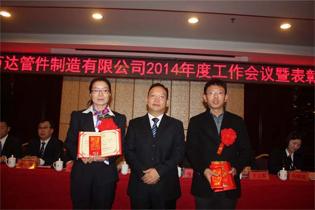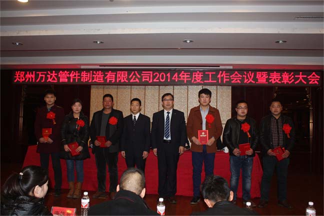 鄭州萬達(dá)管件制造有限公司2014年年會于2015年1月20日隆重召開。會議首先表彰了公司2014年度先進(jìn)工作者、先進(jìn)部門及班組、優(yōu)秀干部、年度進(jìn)步之星、銷售冠軍、優(yōu)秀黨員等十余個獎項,并對獲獎?wù)哳C發(fā)了獎金和證書。公司董事長、黨委書記何清同志在會議上做了題為《適應(yīng)新常態(tài) 開創(chuàng)新局面 實(shí)現(xiàn)公司持續(xù)健康穩(wěn)定發(fā)展 》的報告,總結(jié)了2014年公司的發(fā)展歷程,取得的成績和不足,展望和部署2015年公司發(fā)展的目標(biāo)和重點(diǎn)工作,為公司全力建設(shè)五位一體的萬達(dá)事業(yè)指明了努力方向。公司全體人員中午舉行了盛大的團(tuán)拜招待會,歡聚一堂,其樂融融。
