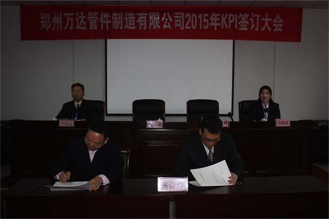 鄭州萬達管件制造有限公司2015年KPI簽訂會于1月30號在公司行政區(qū)會議室隆重舉行,公司班長以上所有管理人員參加了此次簽訂會議。簽訂會分為三級簽訂,即:董事長與總經(jīng)理簽訂、總經(jīng)理與公司各高管簽訂、公司各高管與分管的各部門負責人簽訂,近期,各部門負責人將部門的KPI指標進行分解,與各班組及相關(guān)崗位簽訂目標責任書,達到“千斤重擔人人挑,人人肩上有指標”的責任分解領(lǐng)受,確保最終順利完成公司2015年度各項任務(wù)和目標。