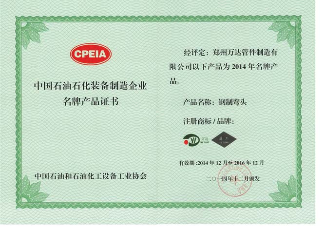 我司“益工”牌“鋼制彎頭”被評(píng)為“2014年中國(guó)石油石化裝備制造企業(yè)名牌產(chǎn)品”