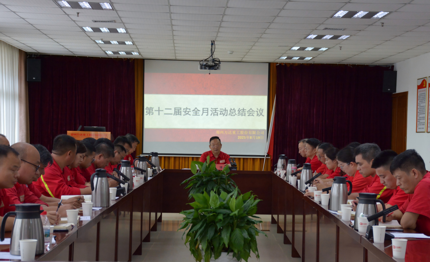 2025/08/20 1035 2025年8月19日下午,鄭州萬達重工股份有限公司在行政樓二樓會議室召開了股份公司第十二屆安全月活動總結(jié)會議。股份公司黨委書記、董事長、活動領導小組組長何清,安