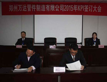 2016/01/28 390 鄭州萬達(dá)管件制造有限公司2015年KPI簽訂會(huì)于1月30號在公司行政區(qū)會(huì)議室隆重舉行,公司班長以上所有管理人員參加了此次簽訂會(huì)議。簽訂會(huì)分為三級簽訂,即:董事長與總經(jīng)理簽訂、總經(jīng)理與公司各高管簽訂、公司各高管與分管的各部門負(fù)責(zé)人簽訂,近期,各部門負(fù)責(zé)人將部門的KPI指標(biāo)進(jìn)行分解,與各班組及相關(guān)崗位簽訂目標(biāo)責(zé)任書,達(dá)到千...